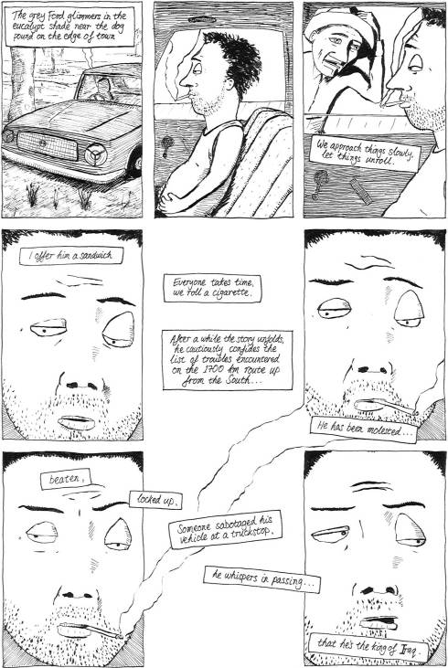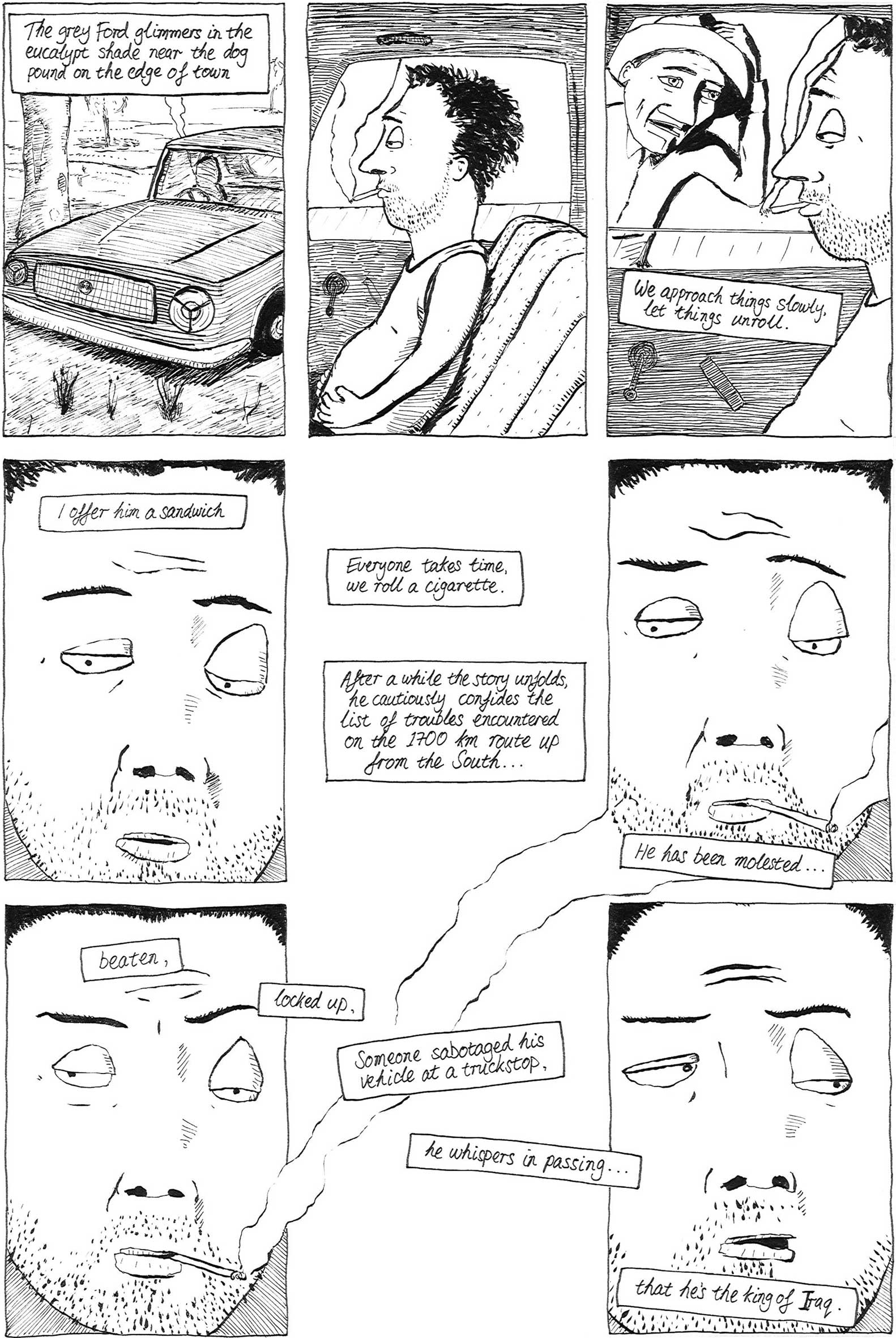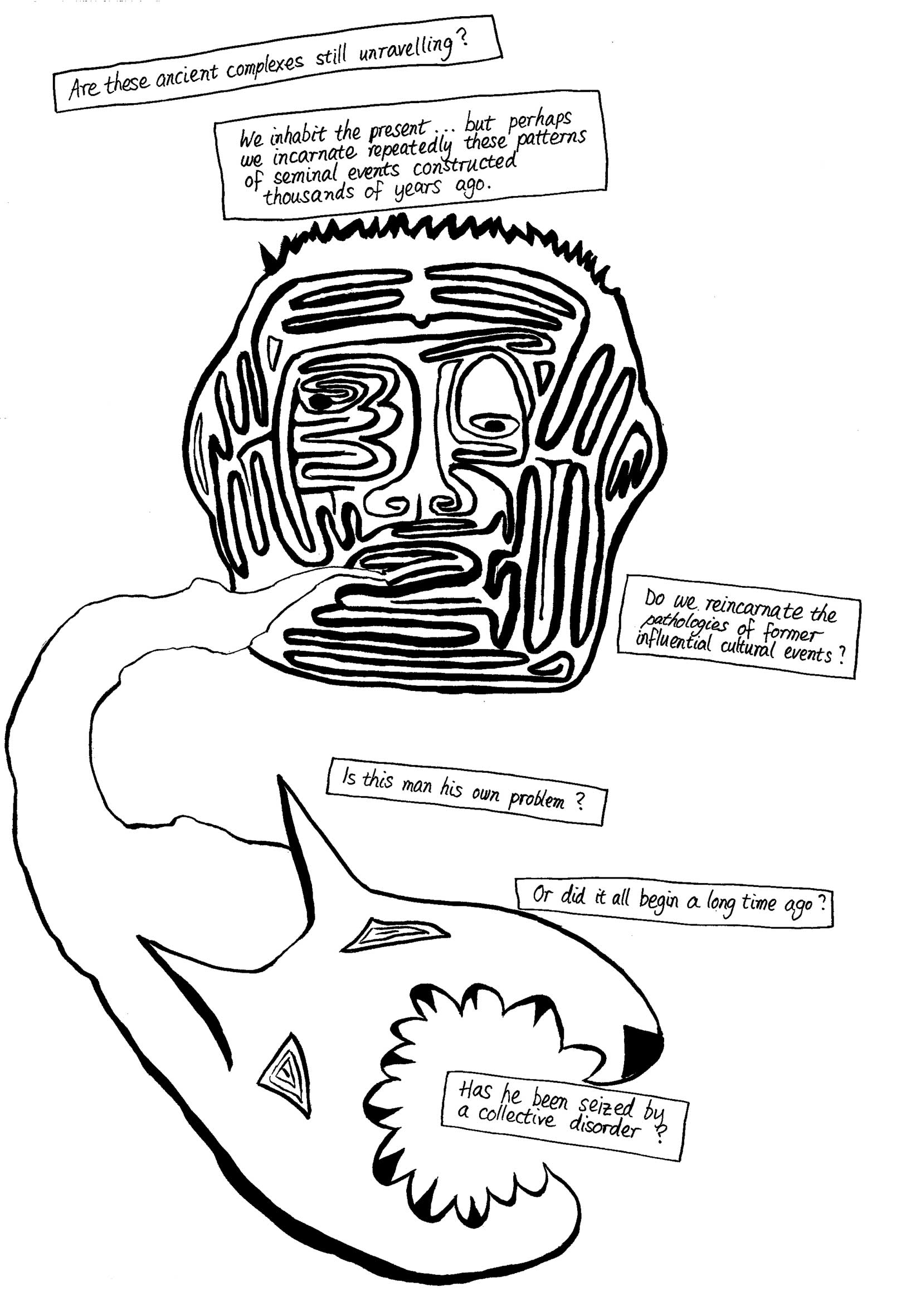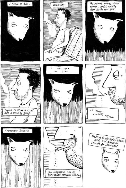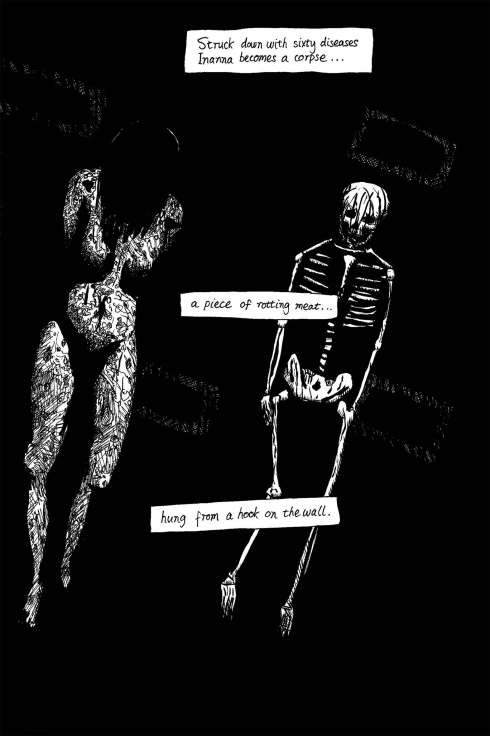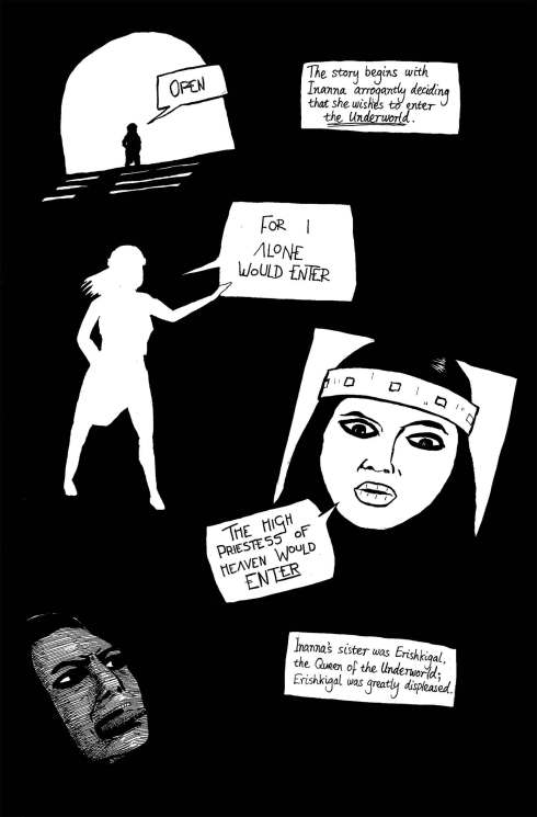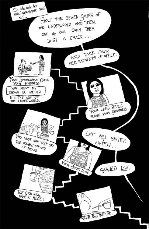 Doing this section was a breath of fresh air for me after doing all the other pages of the Long Weekend which involve a lot of hatching and much more strict formatting and structure. These 13 or so pages I got to be a lot more stretchy and flexible and experiment with layout a lot more, they were also a lot quicker to draw (being a lot more cartoony) which was a lot of fun. Any ol’ comicer can tell you that it’s a slog to do long-form comics, so I’ll take all the variety I can get! The myth of Inanna is only alluded to in Craig San Roque’s original text for the Long Weekend, I just jumped at the opportunity to mix it up a little … there is a point to it, you might have to wait a little before it becomes more obvious.