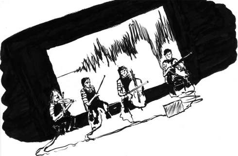 I did this sketch at Princes Wharf 1, MONA FOMA 2012. Watching my friend Michaela from Sydney and her quartet of electricity puppets being played by the seismic readings from the planet since day DOT!! It was quite a performance.