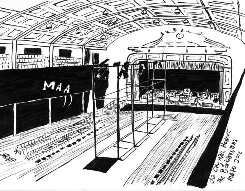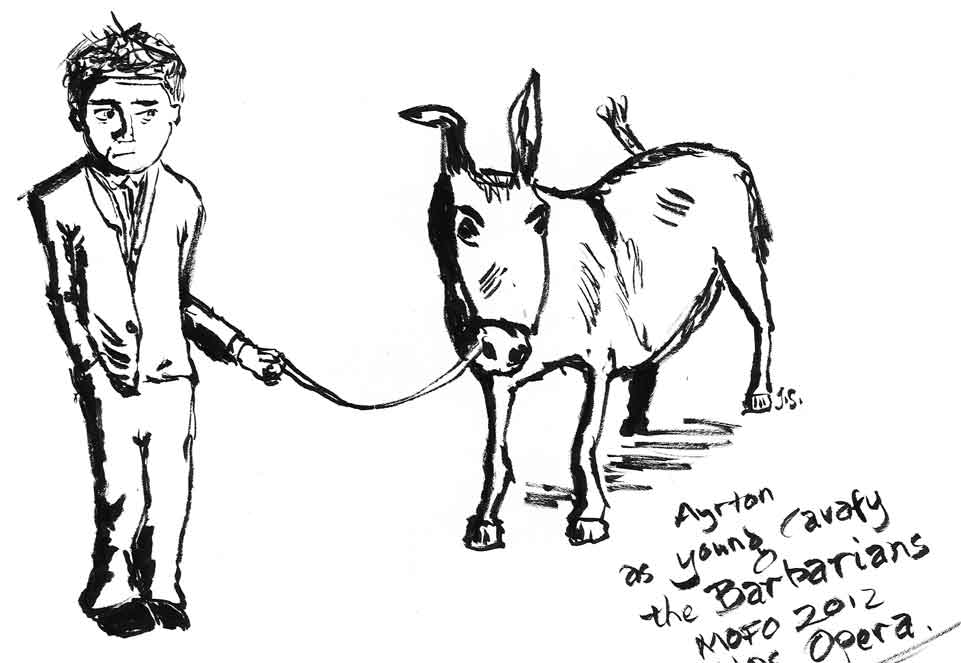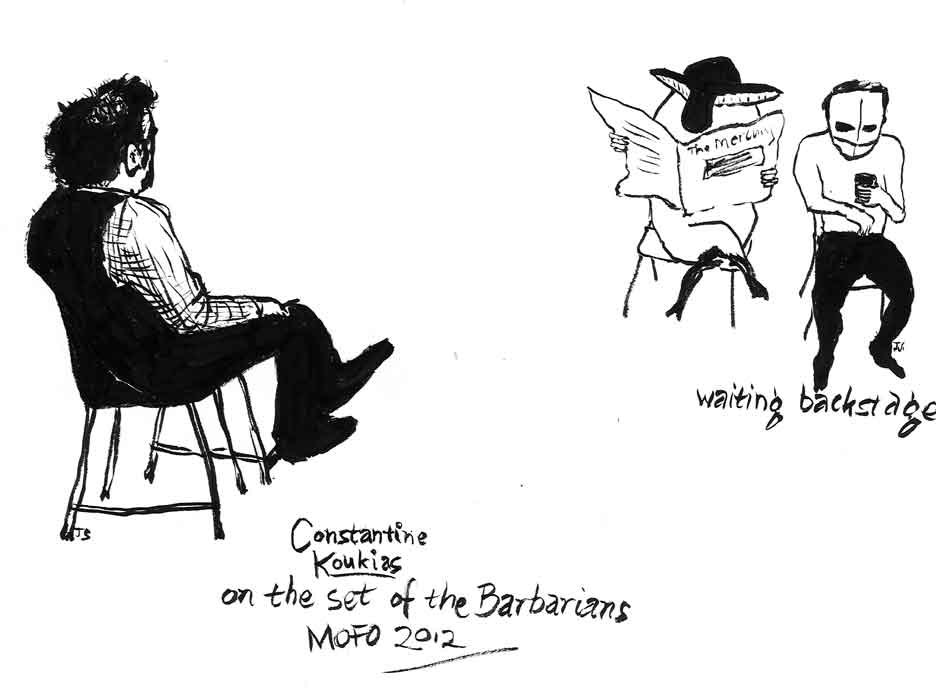 SO – I just finished being a part of the premiere season of the Barbarians as part of IHOS theatre – here’s lots of stuff that I drew whilst I was sitting around the set in the Hobart City Hall as part of MOFO 2012. I was in the Greek Chorus which didn’t involve much talking, but a lot of costume changes, the last of which involved us ten blokes being draped in a necklace of offal and being squirted with genuine blood. I assure you that it was a very funny sight to see 10 grown men charging through the backstage area drenched in blood and only wearing their knickerbockers to get to one of the four the showers first. Bravo Constantine Koukias and bravo IHOS – it was tops! And well done to MONA for commissioning this very very very amazing production!