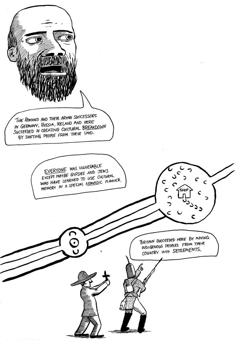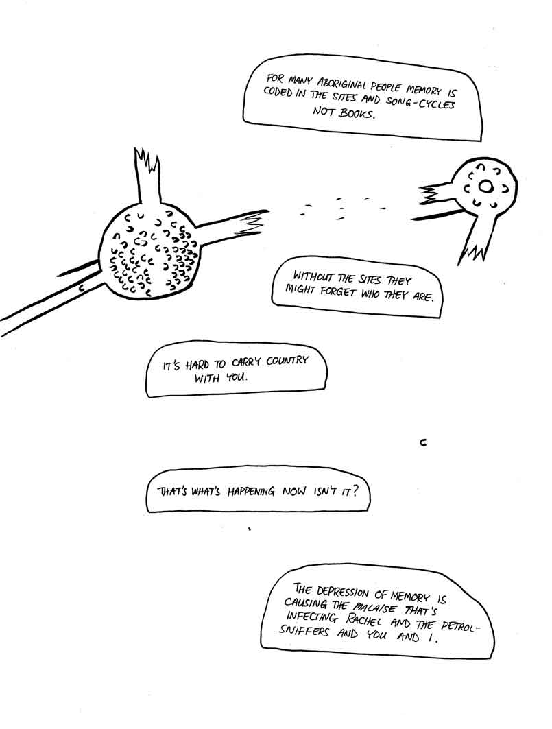 On these pages here I broke from the panels completely – It was an exceptionally wordy part … but I kind of liked the conversation in the essay and didn’t want to scrap that chatting aspect to the writing. In fact – in my mind I had a second name for the third chapter – The Conversation. Most of what’s written here is probably known in Australia and isn’t really ground-breaking stuff – the bit that quite dig is the last bit on the last page which implies that what is happening to Indigenous people is a process that is affecting us all … which is something I feel keenly in this country – the trauma of colonisation is something felt by everyone, whether they are aware of it or not.