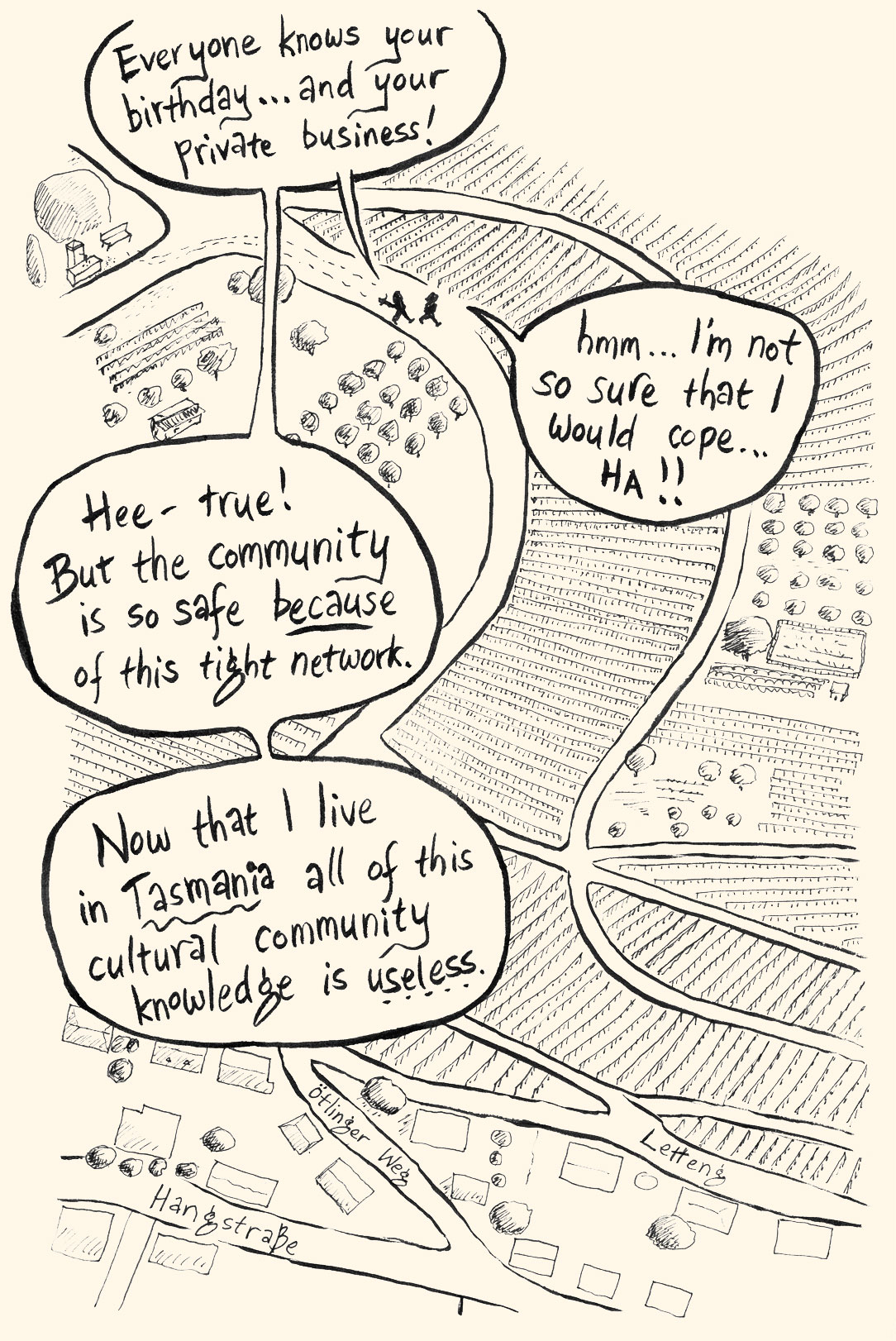 These are the pages 5-8 of it, set in Germany in the village that Hobart-based book designer Nadine Kessler grew up in, but most of the book is set in Melbourne. I’ll chuck up the next pages in a week or so when the PREORDER Pozible campaign commences on April 1 – when this website page will be up and running (not before April 1). The preorder campaign runs for the entirety of APRIL, which will help me out greatly with the money to print the books – some info at the bottom.