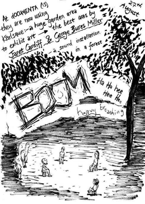 13 SepA couple more sketchy drawings from our time at dOCUMENTA(13) whilst we were gallavanting around Europa – the Moon / Jeon film was a beautiful piece of work!! HOWEVER – the best thing at the whole of dOCUMENTA was that Cardiff/Bures-Miller sound art piece in the Karlsaue